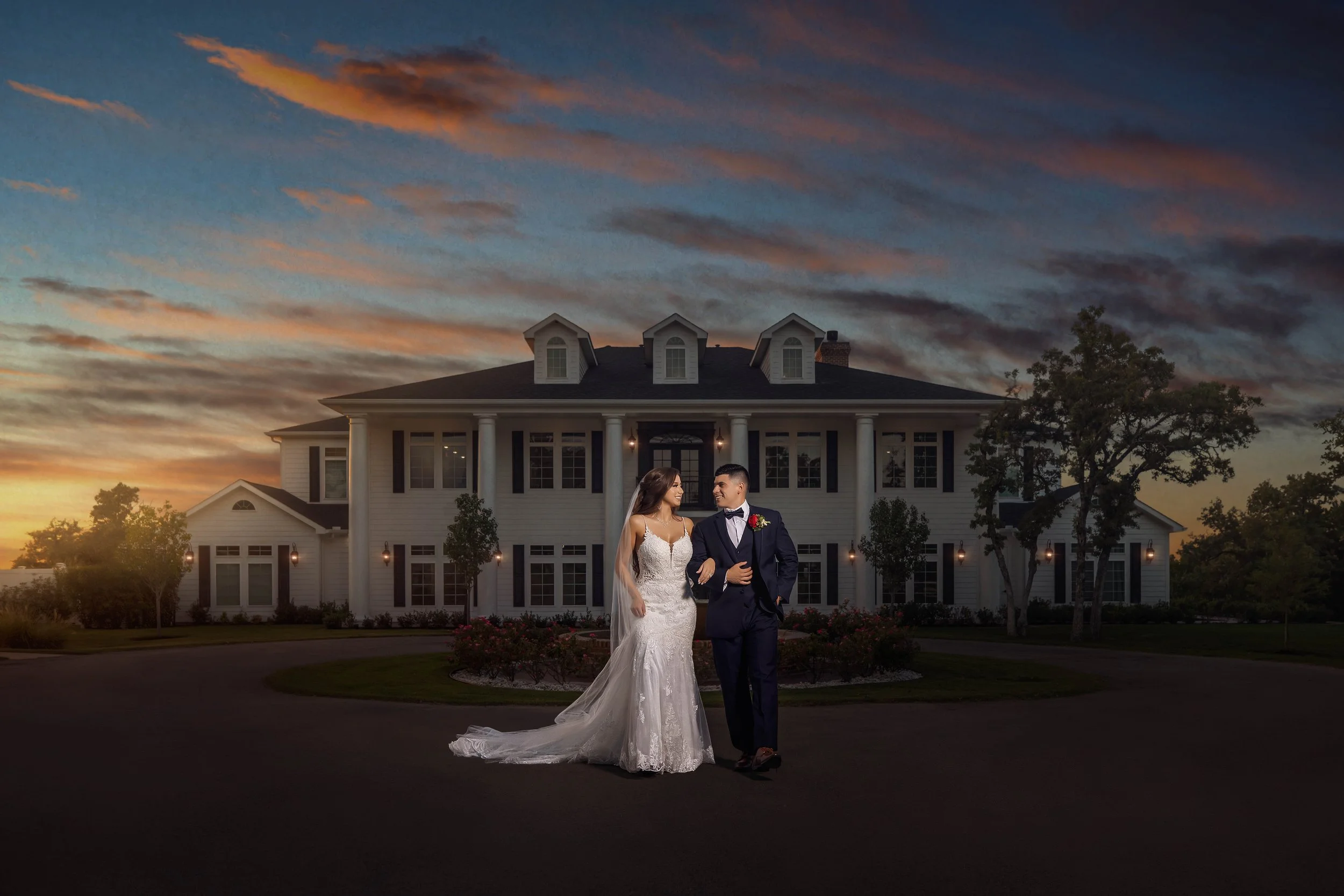 Two picture-perfect venues await you at The Springs in Weatherford, Texas. A ranch-style venue, Westwood Hall, and a manor-style venue, Parker Manor. Westwood Hall features a spacious indoor reception hall with warm wood-finish walls, bright chandeliers, and a statement grand staircase. Outdoors, you can find relaxing water features directing you to the stone-lined outdoor ceremony site with a covered pavilion. Parker Manor is a breathtaking mansion that greets you with an open circle drive, a picturesque fountain, and its grand walk-up facade. But it gets better, just wait until you see the incredible views from the balcony. You have a wonderful view of the outdoor ceremony site and a romantic place to watch those gorgeous Texas sunsets. The interior of Parker Manor is home to a grand fireplace, sweeping staircase, and a magnificent and elegant chandelier.